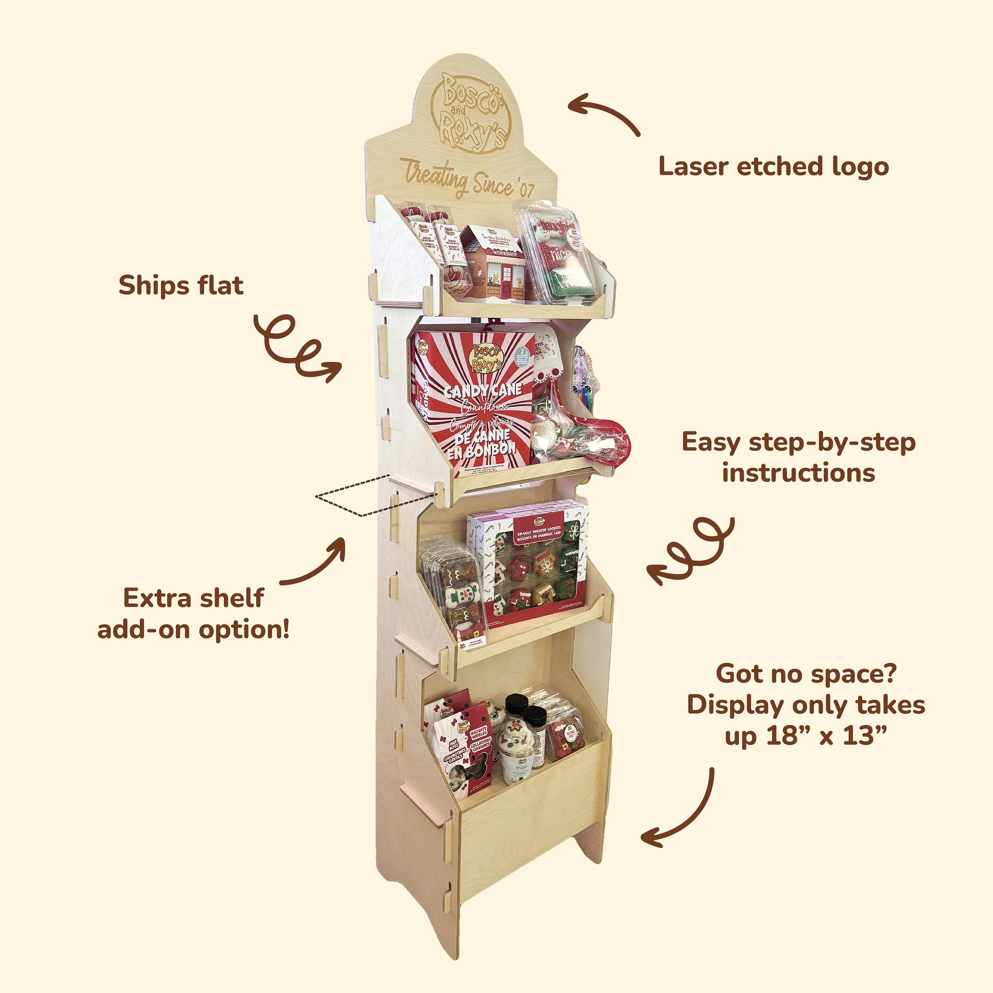 Strategically placed displays like this are proven to increase revenue by encouraging impulse purchases. Customers are far more likely to grab an item they see beautifully merchandised and within reach. From seasonal dog cookies to everyday treats or accessories, this display helps turn browsers into buyers.